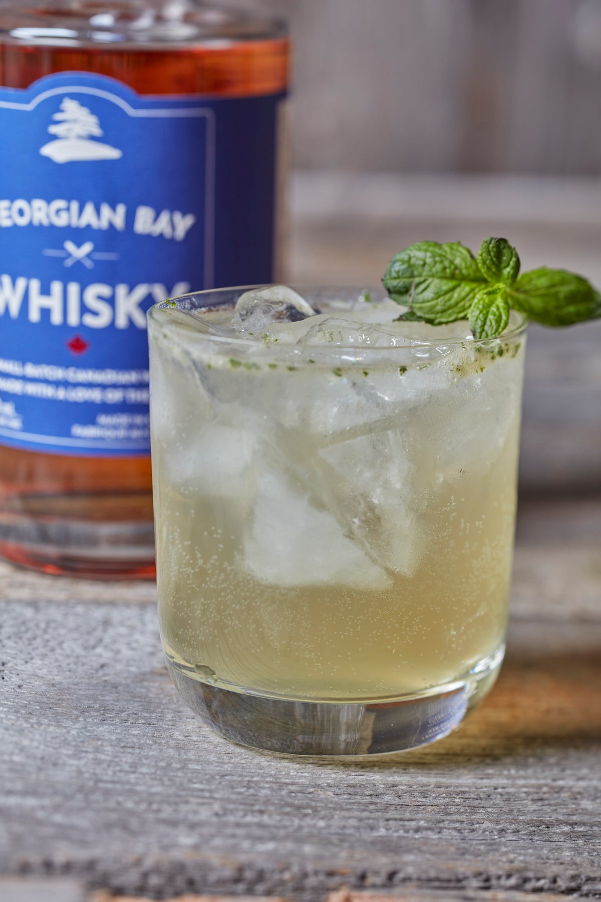 Add Georgian Bay Whisky, simple syrup, mint leaves, ice and shake until well-chilled.