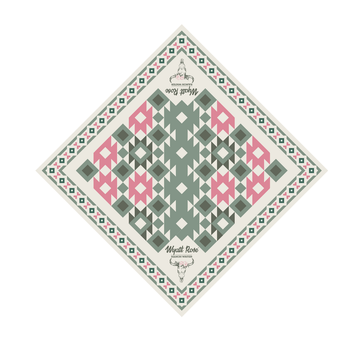 Wyatt Rose bandana in a stylish aztec pattern. Single-sided print in green, pink and white.